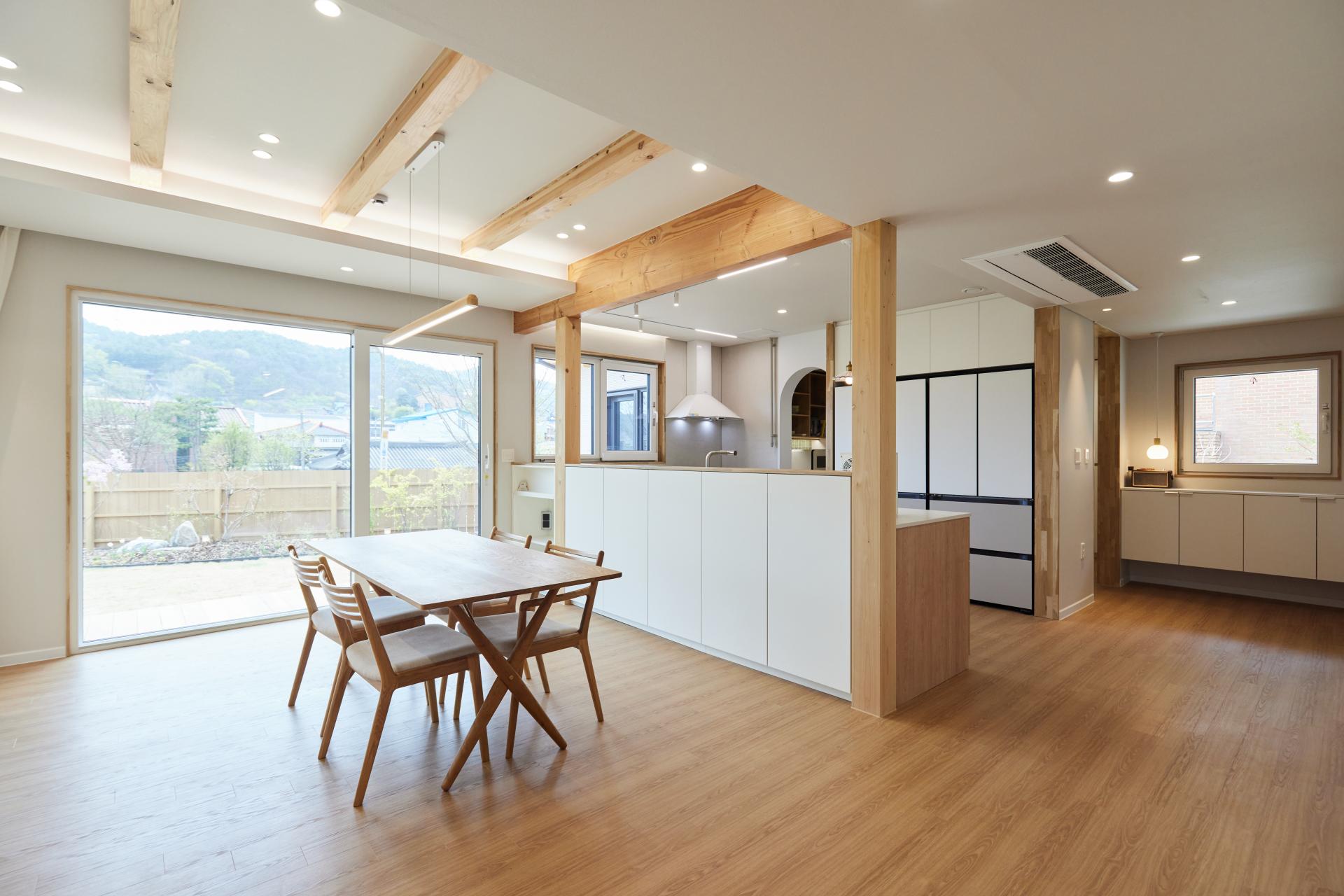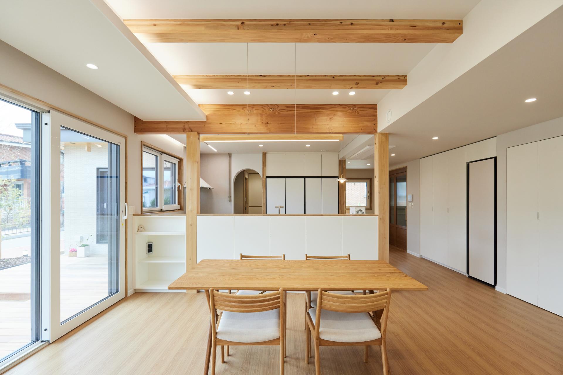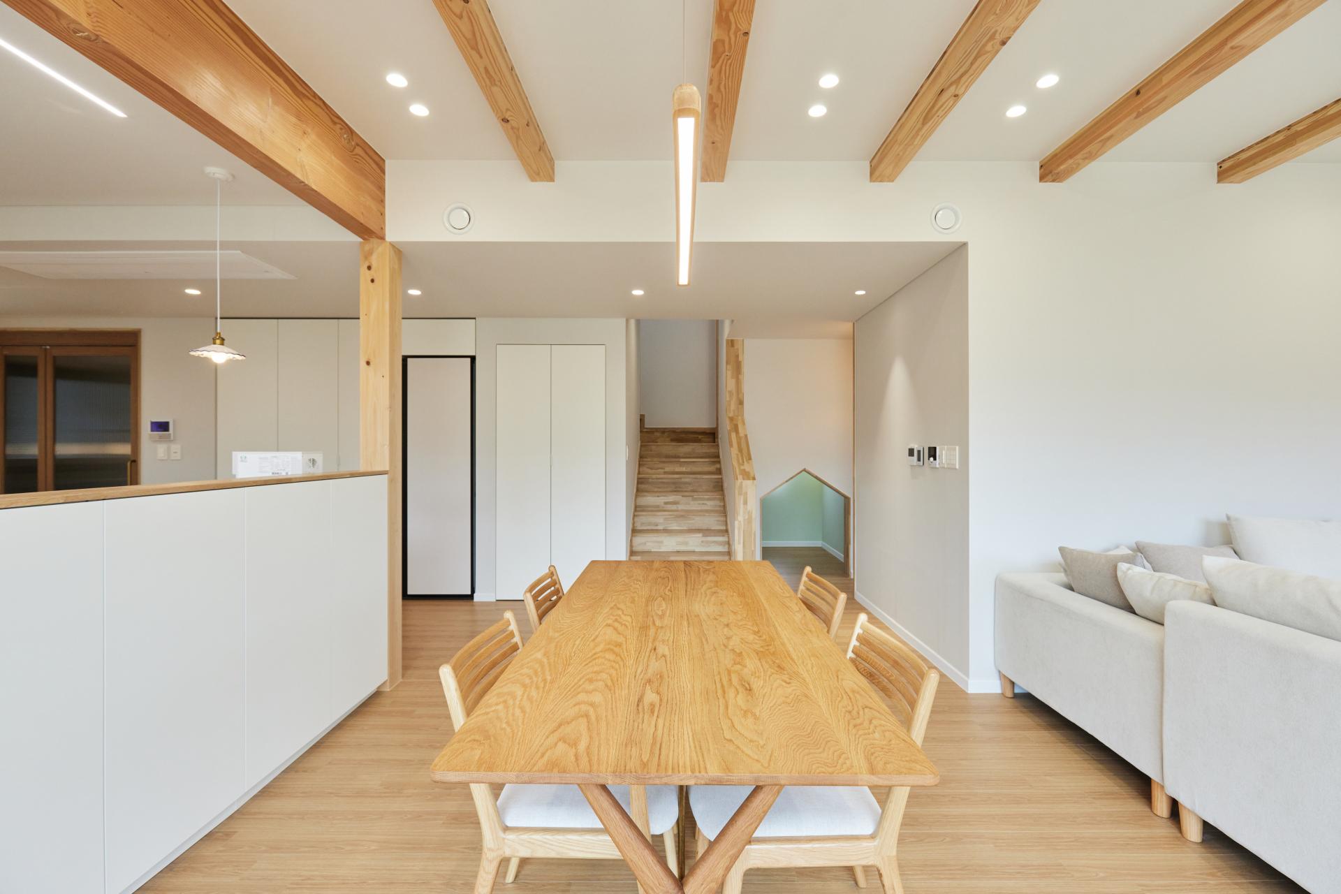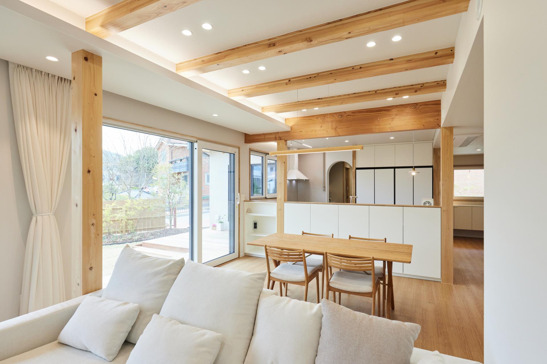 #중목구조 #중목구조설계 #인테리어설계 #화이트톤 #우드톤 #무몰딩 #심플한 디자인 #우드톤주방 #대면형주방 #노출기둥 #간접조명 #히노끼루버 #휴젠뜨 #친환경벽지 #우드데크 #저에너지주택 #아이콧료와세라믹타일 #아쿠아폼 #시스템에어컨 #중목구조의 목재 노출이 한옥처럼 아름다운 집 #오카메이코리아 #岡本銘木店 #軸組構法 #金物工法 #在来工法