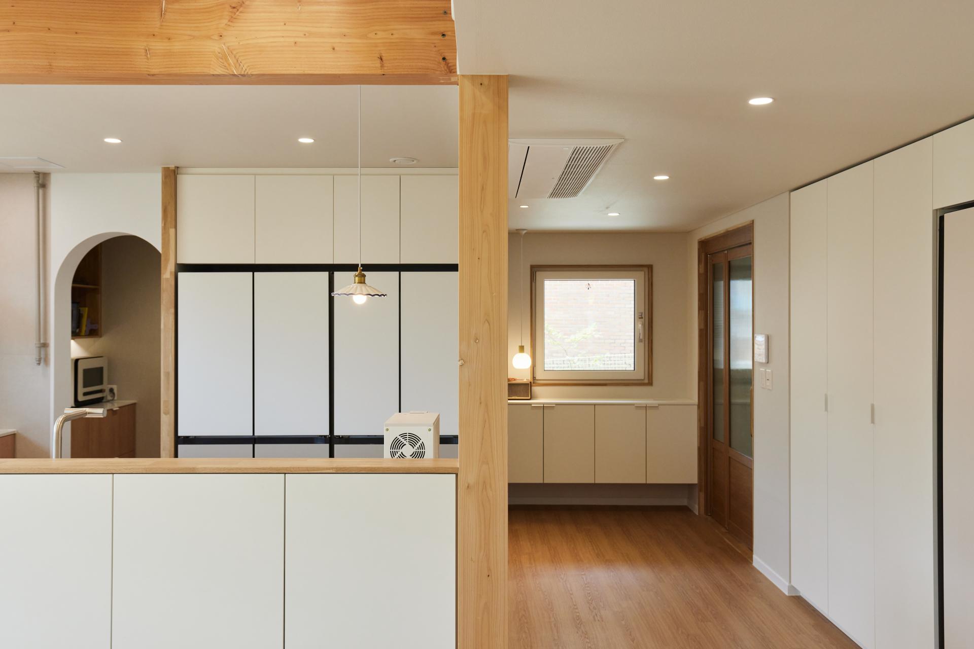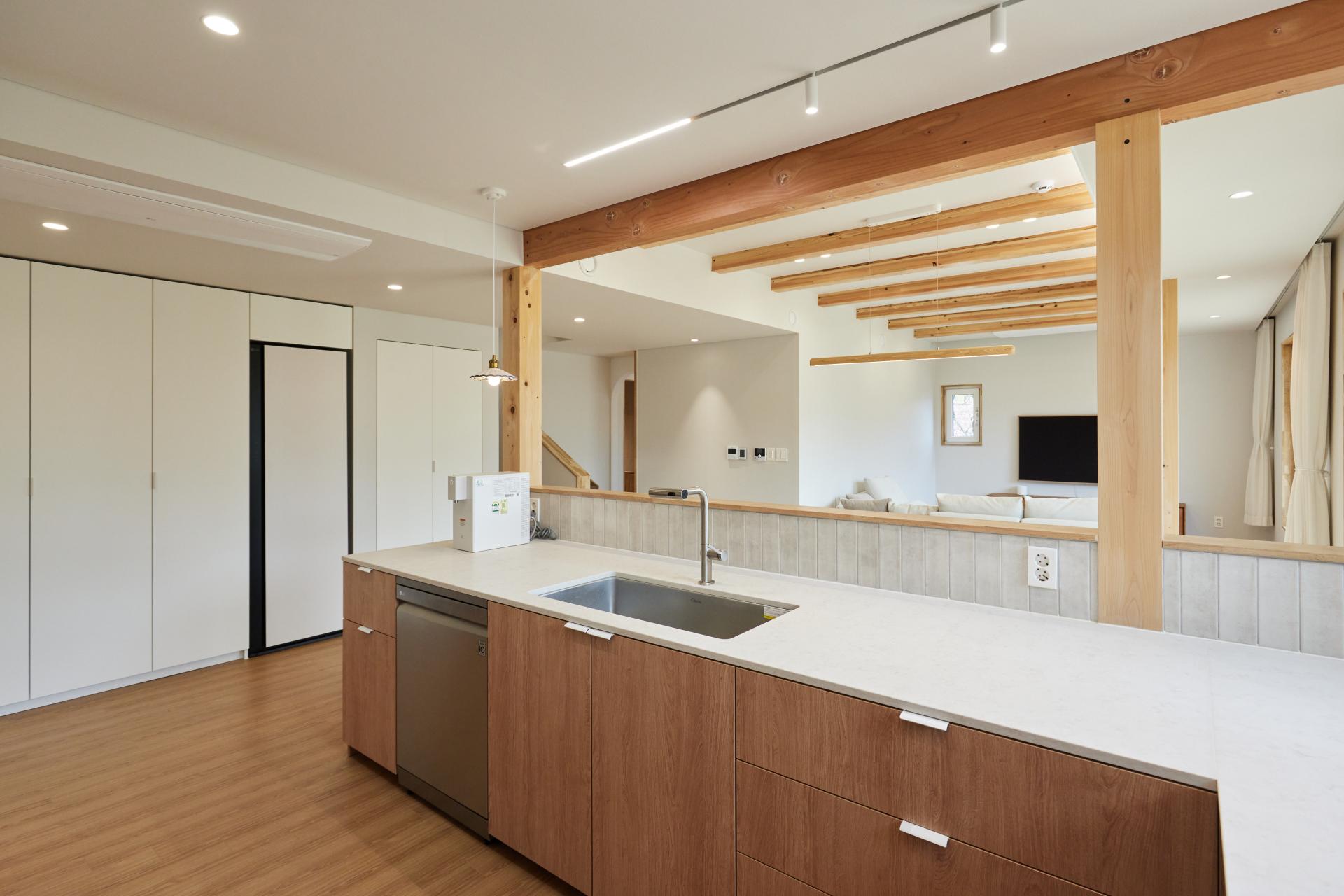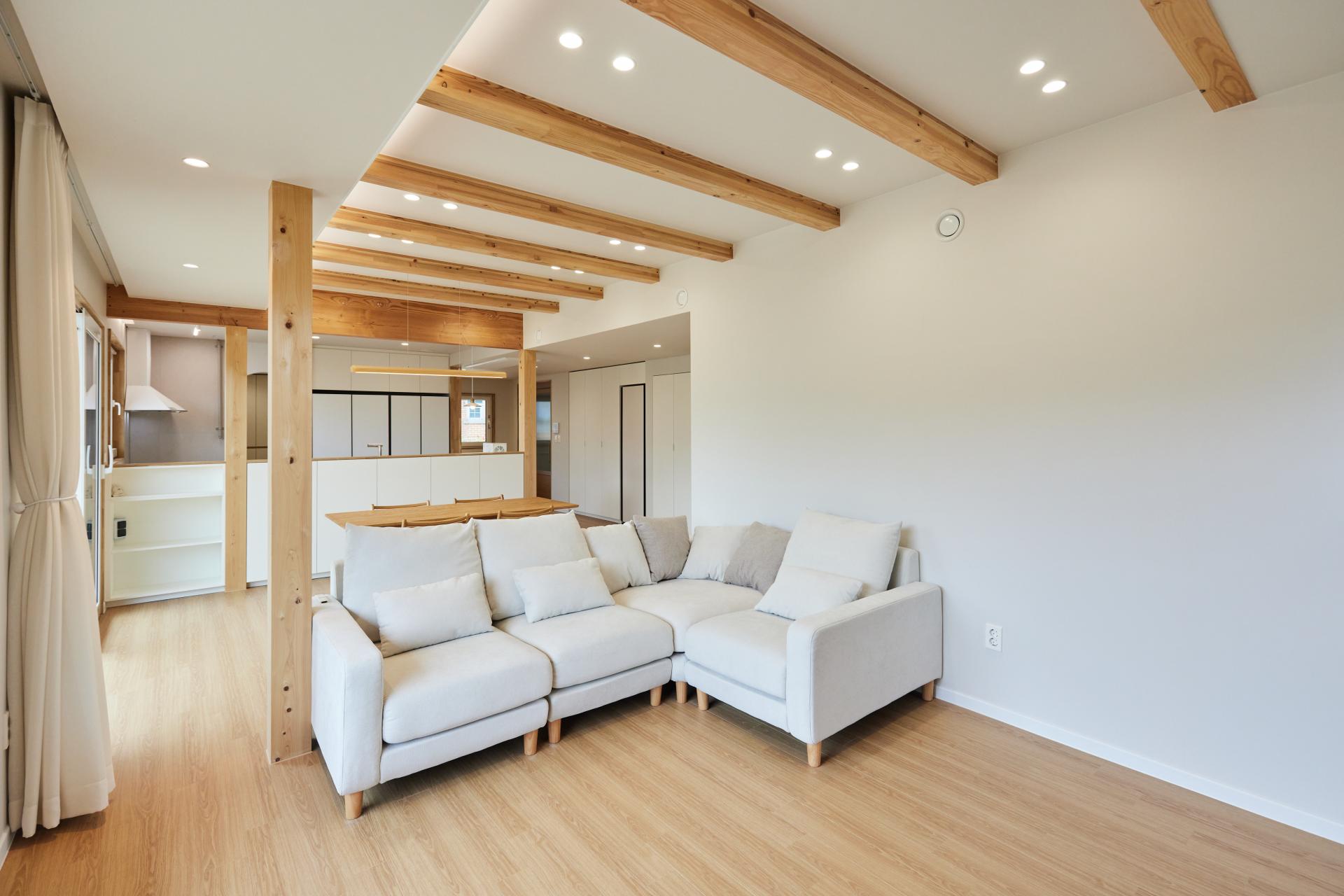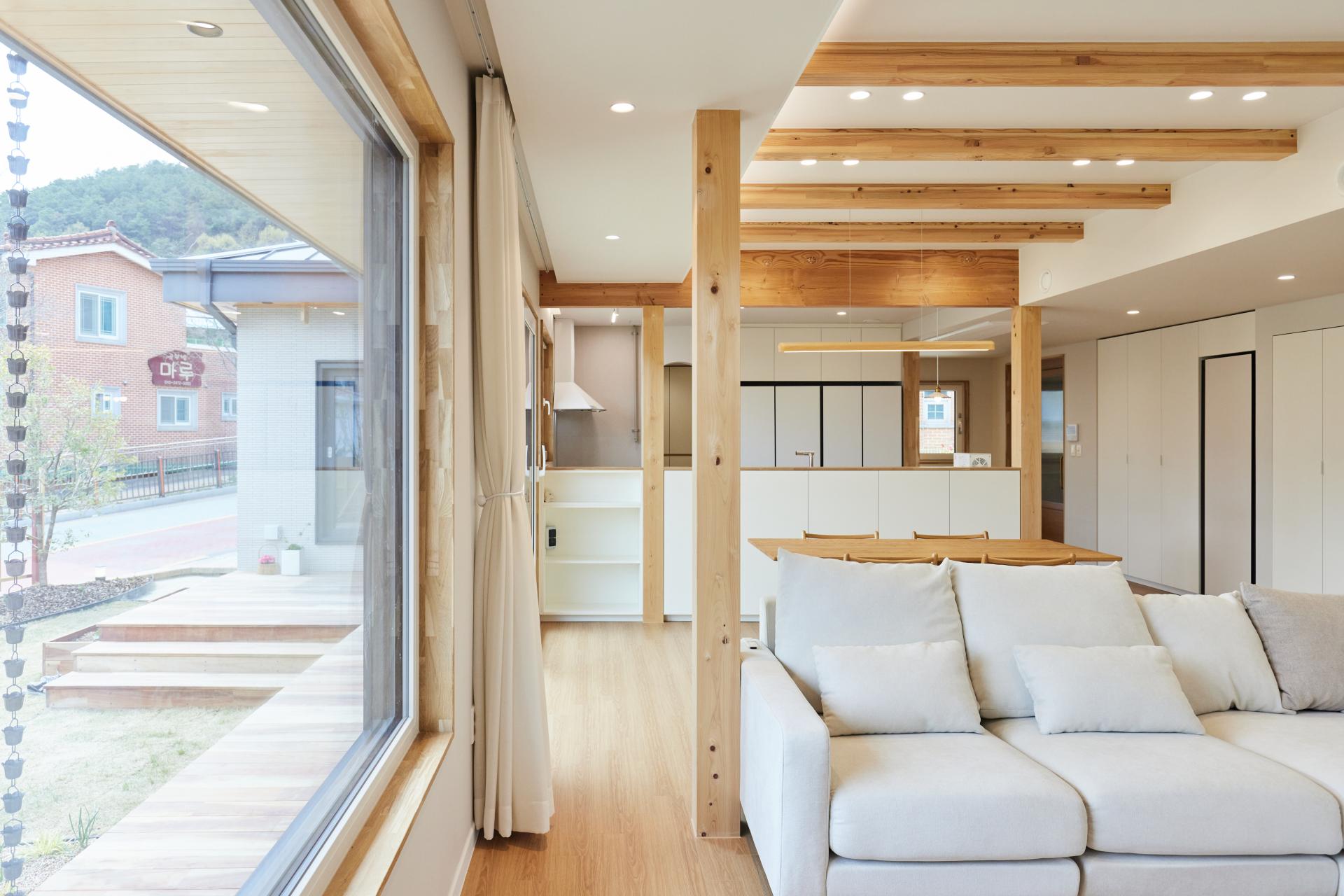 #중목구조 #중목구조설계 #인테리어설계 #화이트톤 #우드톤 #무몰딩 #심플한 디자인 #우드톤주방 #대면형주방 #노출기둥 #간접조명 #히노끼루버 #휴젠뜨 #친환경벽지 #우드데크 #저에너지주택 #아이콧료와세라믹타일 #아쿠아폼 #시스템에어컨 #중목구조의 목재 노출이 한옥처럼 아름다운 집 #오카메이코리아 #岡本銘木店 #軸組構法 #金物工法 #在来工法